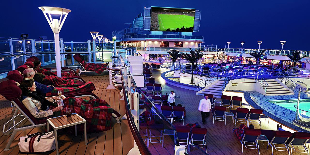 Pihenés a fedélzeten. Hangulatos éttermek és bárok, a The Piazza forgataga, sportpályák, medencék gondoskodnak a kikapcsolódásról.