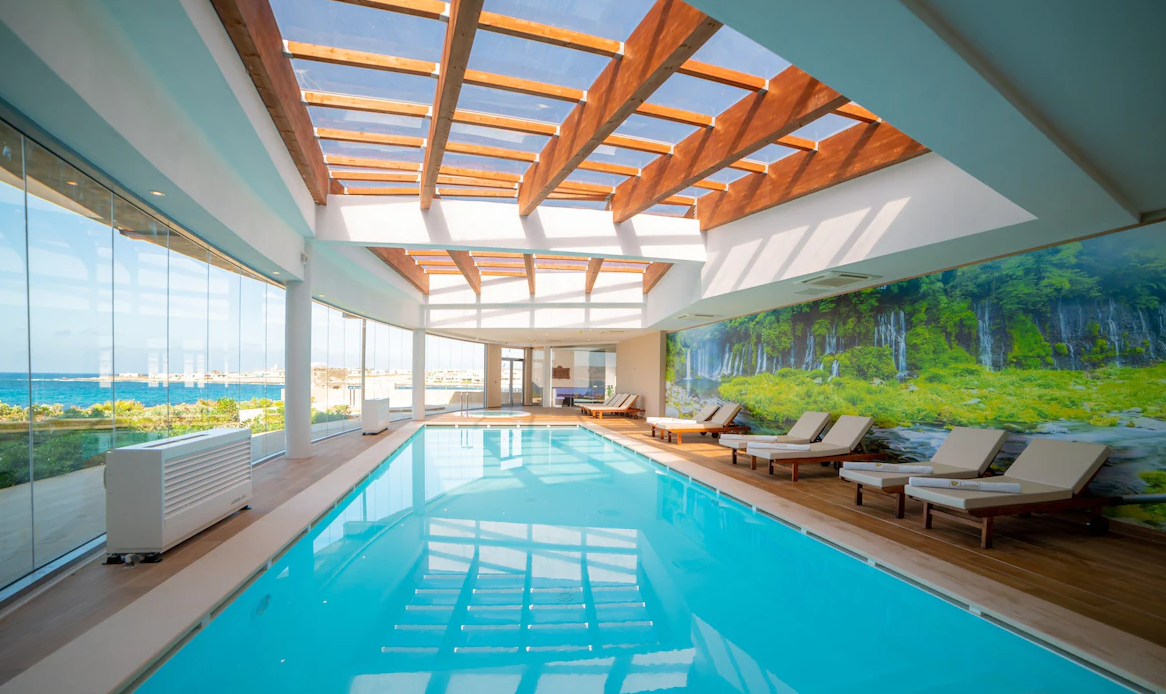 A mediterrán stílusú szálloda kültéri részén 3 sós vizes medence található külön gyermekmedencével (májustól októberig tart nyitva). Itt ingyenesen használható napernyők és nyugágyak állnak rendelkezésre. A medence bárjában frissítő italokat fogyaszthatnak az utasok.