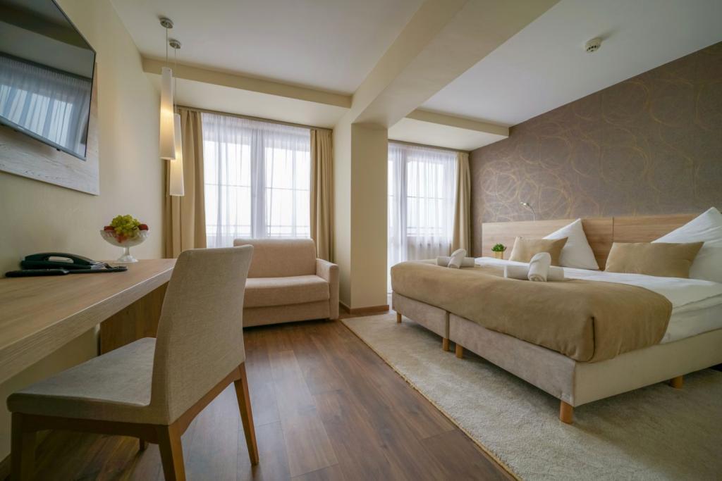A völgyre vagy a hegyekre néző exkluzív szoba egy modern és stílusosan berendezett szoba, vonzó dizájnnal. A szobában egy king-size ágy és egy kanapé található, amely felnőtt számára külön teljes méretű ágyként is használható. A külön fürdőszobában kád vagy zuhanyzó és WC található. Alapfelszereltség: íróasztal székkel, szekrények, telefon, széf, minibár, beépített hajszárító, műholdas TV és Wi-Fi kapcsolat.